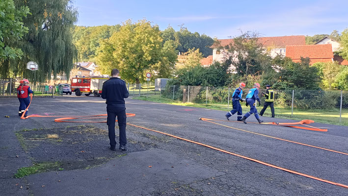Nachdem die übungstechnisch eher entspannten Sommerferien vorüber waren, wurde sich in den letzten Wochen intensiv auf den Gemeindewettbewerb der Brachttaler Jugendfeuerwehren vorzubereitet. Bei den Jugendlichen war die Vorfreude darauf besonders groß, da der Wettbewerb im letzten Jahr leider abgesagt wurde. Erstmalig fand die Durchführung in Neuenschmidten auf dem Parkplatz hinter dem Alten Konsum statt. Die Auslosung der Startreihenfolge hat ergeben, dass wir als jeweils erste Mannschaft bei den praktischen Übungen an den Start gingen. Dabei muss einerseits ein Löschangriff mit einem Unterflurhydranten als Wasserentnahmestelle aufgebaut werden, wobei die gesamte Übung „trocken“, also ohne eine Wasserabgabe erfolgt. Zusätzlich galt es vier Knoten an einem Knotengestell anzulegen, welche ebenfalls mit in die Zeitwertung eingehen. Des Weiteren gibt es einen 400 m-Staffellauf, bei welchem verschiedene feuerwehrtechnische Aufgaben erfüllt werden müssen (u.a. einen Schlauch rollen, ein Strahlrohr einbinden und einen Leinenbeutel werfen). Für beide Teile gibt es eine vorgegebene Punktzahl, von welcher bei Fehlern jeweils Punkte abgezogen werden.